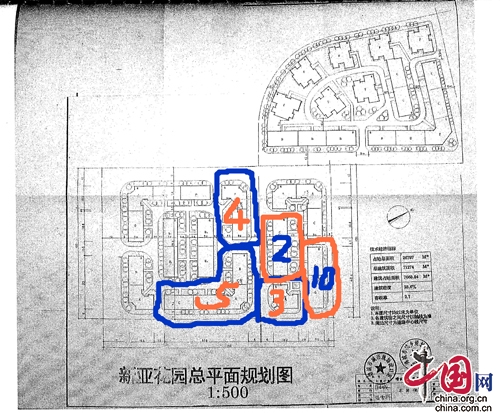 圖片說明:新亞花園總平面規劃圖中,藍色劃線內為3號、4號、5號樓。紅色劃線內為2號、10號樓