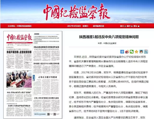目前,經陜西省紀委常委會研究并報省委常委會審議通過,給予鄭東平黨內嚴重警告處分,免去現任職務,調離紀檢監(jiān)察系統(tǒng),責令其退賠相關費用;給予楊錦黨內嚴重警告處分,免去現任職務,調離省委辦公廳。給予其他8名干部黨內警告處分,1名干部批評教育。
