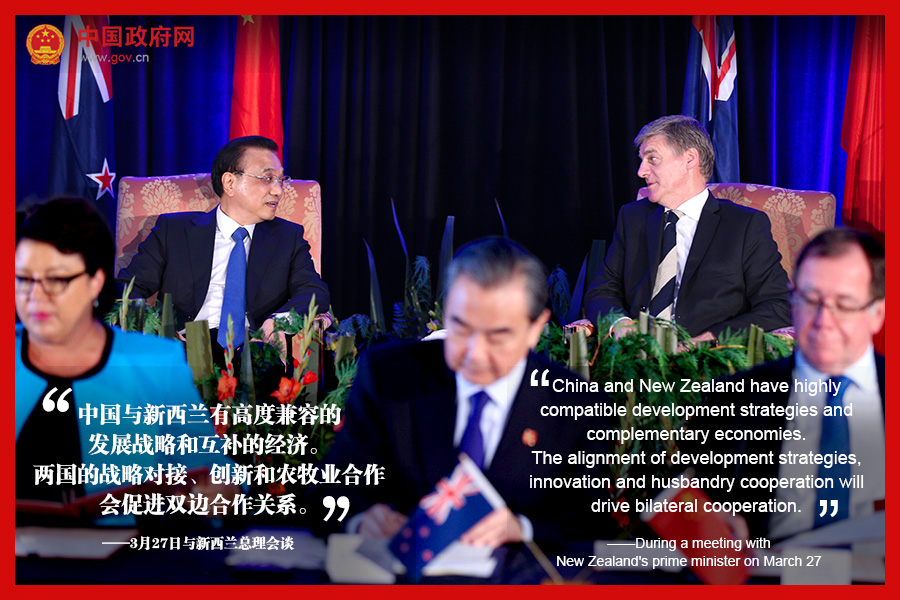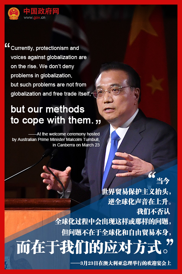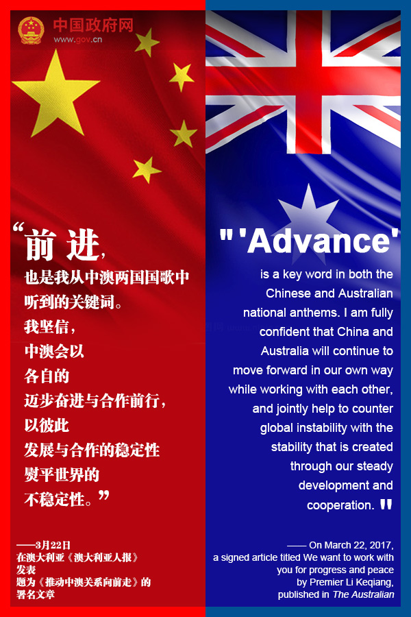 國務院總理李克強于3月22日至29日對澳大利亞和新西蘭進行正式訪問,這也是11年來中國總理對這兩個國家的首次訪問。海外關注李克強總理的哪些話?中國政府網用8張海報帶你一起來看看,雙語啊!