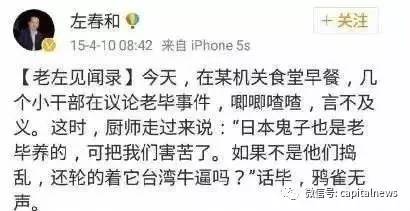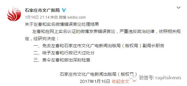 今年1月,左春和被免去石家莊文化廣電新聞出版局副局長的職務(wù),原因是在微博發(fā)表錯(cuò)誤言論,嚴(yán)重違反政治紀(jì)律。