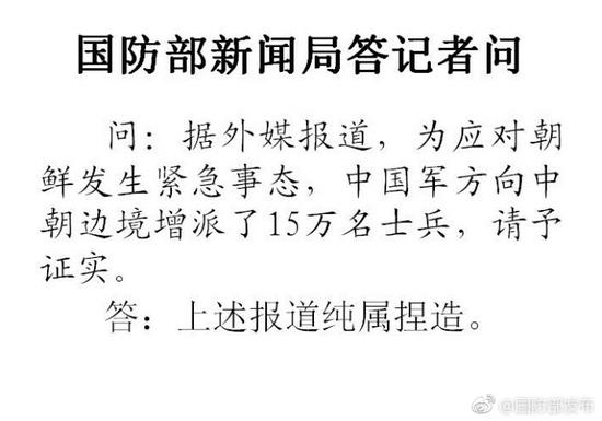 問:據外媒報道,為應對朝鮮發生緊急事態,中國軍方向中朝邊境增派了15萬名士兵,請予證實。