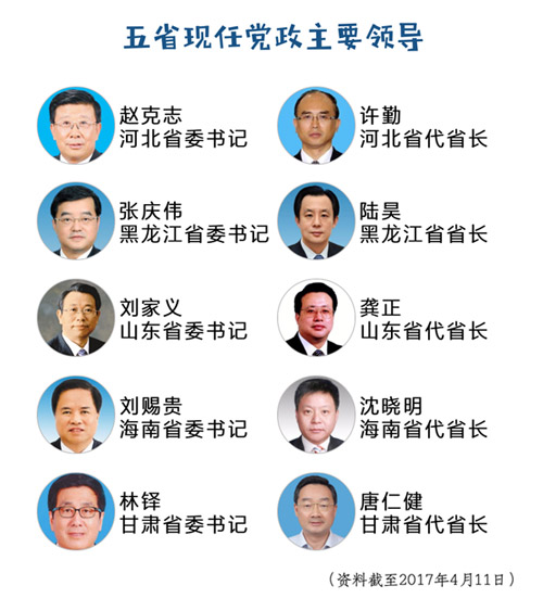 4月1日,黑龍江、山東、海南、甘肅四省省委主要負(fù)責(zé)同志職務(wù)調(diào)整。4位履新省委書記中,黑龍江省委書記張慶偉由河北省省長轉(zhuǎn)任,甘肅省委書記林鐸、海南省委書記劉賜貴2人為本省省政府“一把手”轉(zhuǎn)任,山東省委書記劉家義系中央“空降”。