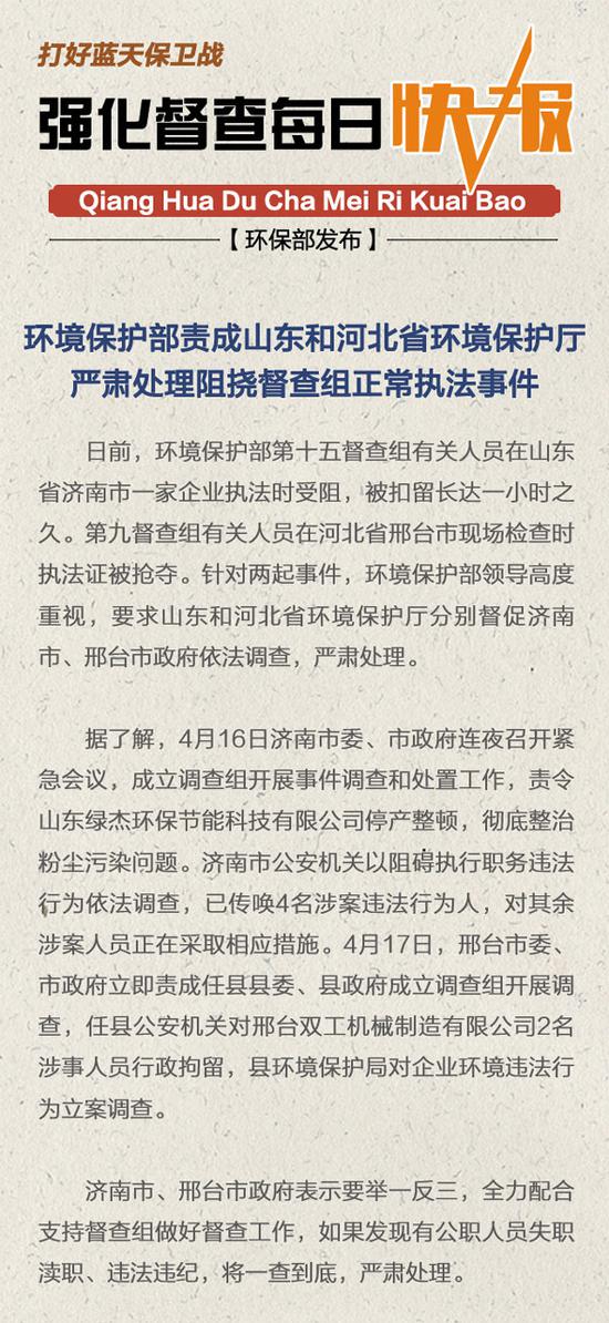 新華社北京4月17日電(記者胡璐、高敬)日前,環境保護部第十五督查組有關人員在山東省濟南市一家企業執法時受阻,被扣留長達一小時之久。第九督查組有關人員在河北省邢臺市現場檢查時執法證被搶奪。環保部17日晚間表示,針對兩起事件,已要求山東和河北省環境保護廳分別督促濟南市、邢臺市政府依法調查,嚴肅處理。