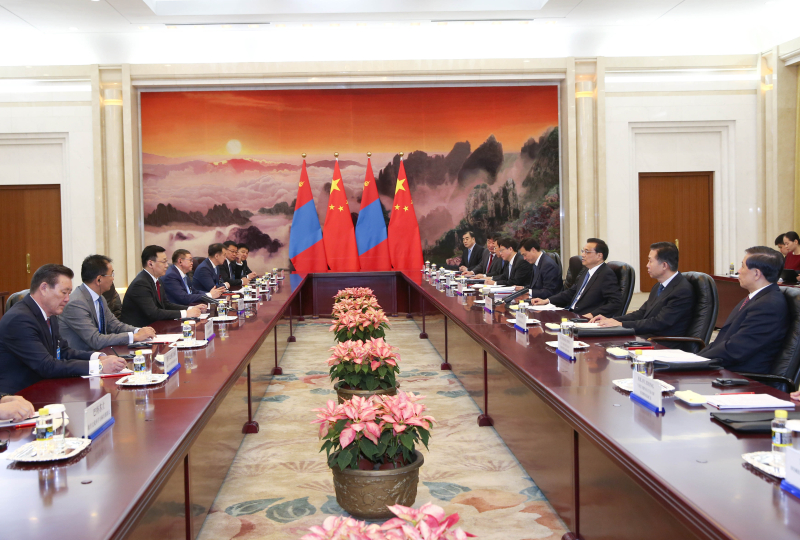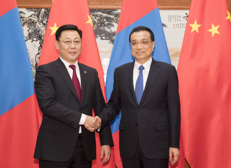 李克強表示,中蒙兩國是友好鄰邦和全面戰略伙伴。雙方要繼續本著相互尊重、平等相待的原則,切實尊重彼此核心利益和重大關切,鞏固中蒙關系的政治基礎。我們愿加快“一帶一路”倡議同蒙方“發展之路”戰略對接,加大對跨境口岸建設和跨境經貿合作的投入,做好中蒙自貿區聯合可行性研究相關工作,提升兩國經貿合作水平。落實好住宅建設、農畜產品深加工、能源資源利用等領域達成的合作共識,更好實現互利共贏、共同發展。