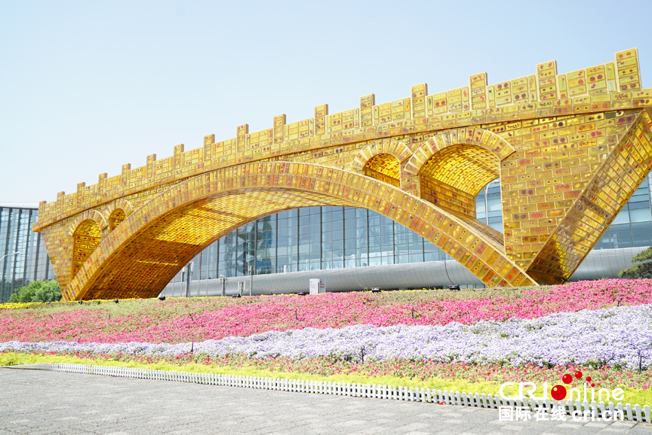 經(jīng)過(guò)嚴(yán)格的安檢,記者來(lái)到了國(guó)家會(huì)議中心的前廣場(chǎng)。一座由琥珀金磚搭建成的金橋格外醒目,這個(gè)名為“絲路金橋”的景觀作品主體結(jié)構(gòu)模仿隋代建筑趙州橋,并以多個(gè)國(guó)家和城市的五十多種國(guó)花或市花為原型制作絲綢絹花,嵌入到“絲路金磚”中,象征著各國(guó)人民交流互通、共贏共生。