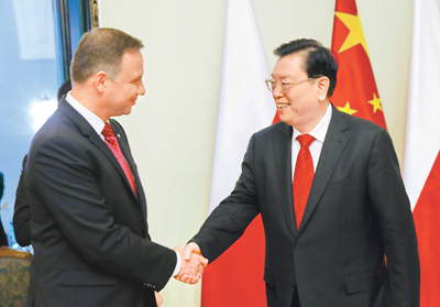 7月12日至16日,應波蘭眾議長庫赫欽斯基邀請,全國人大常委會委員長張德江對波蘭進行正式友好訪問。這是7月16日,張德江在華沙會見波蘭總統杜達。