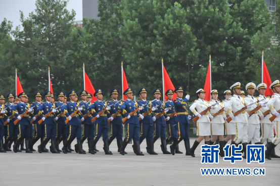 7月17日,中國人民解放軍三軍儀仗隊進行迎賓動作表演。新華網記者黃河攝