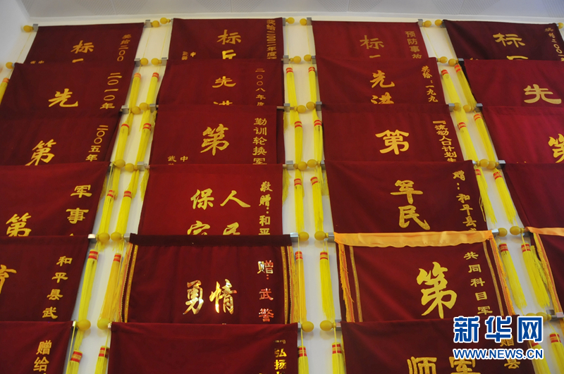 7月18日,網絡媒體國防行記者團參觀武警廣東總隊河源市支隊和平縣中隊。圖為中隊榮譽室中擺放著的部分錦旗。新華網記者 黃河攝