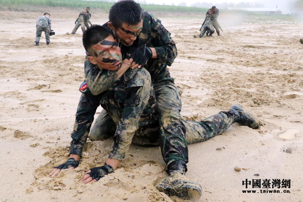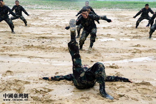 第78集團軍某特戰旅戰士在雨中進行捕俘拳科目演練。(中國臺灣網 陳佳慧 攝)
