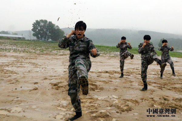 第78集團軍某特戰旅女兵在雨中進行捕俘拳科目演練。(中國臺灣網 陳佳慧 攝)