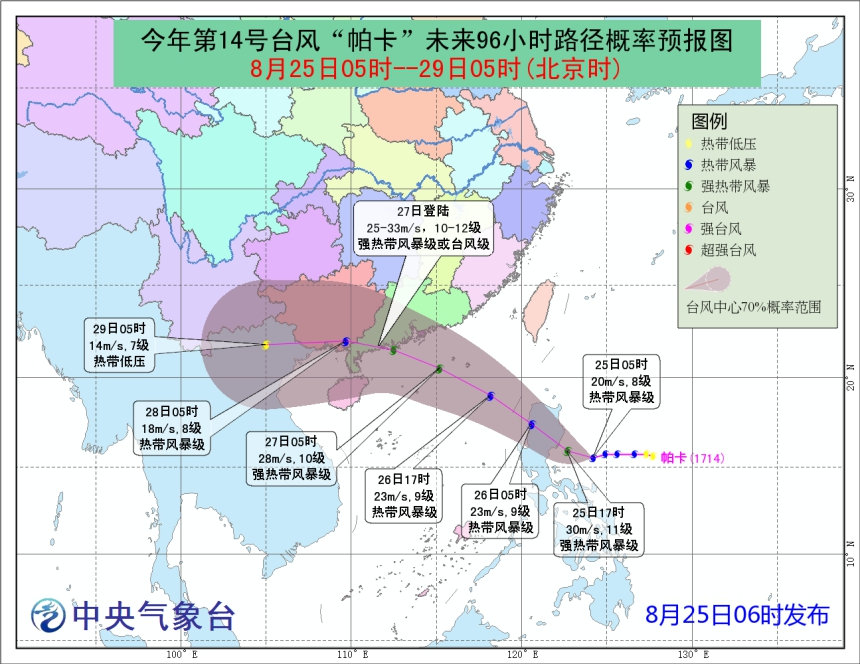 人民網(wǎng)北京8月25日電 中央氣象臺25日06時發(fā)布臺風(fēng)藍(lán)色預(yù)警:菲律賓東部洋面的熱帶低壓已于昨天(24日)晚上加強(qiáng)為今年第14號臺風(fēng)“帕卡”,今天(25日)早晨5點(diǎn)鐘其中心位于菲律賓馬尼拉東偏北方約360公里的洋面上,就是北緯15.5度、東經(jīng)124.2度,中心附近最大風(fēng)力8級(20米/秒),中心最低氣壓995百帕,七級風(fēng)圈半徑120-180公里。