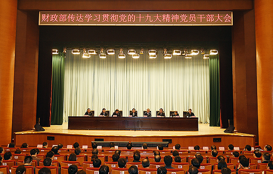 10月26日下午,部黨組書記、部長肖捷主持召開財政部黨員干部大會,傳達黨的十九大精神,動員部署學習貫徹工作。會議介紹了黨的十九大盛況,傳達了黨的十九大報告主要精神,傳達了中央紀委工作報告的主要精神和黨章修改的主要情況。