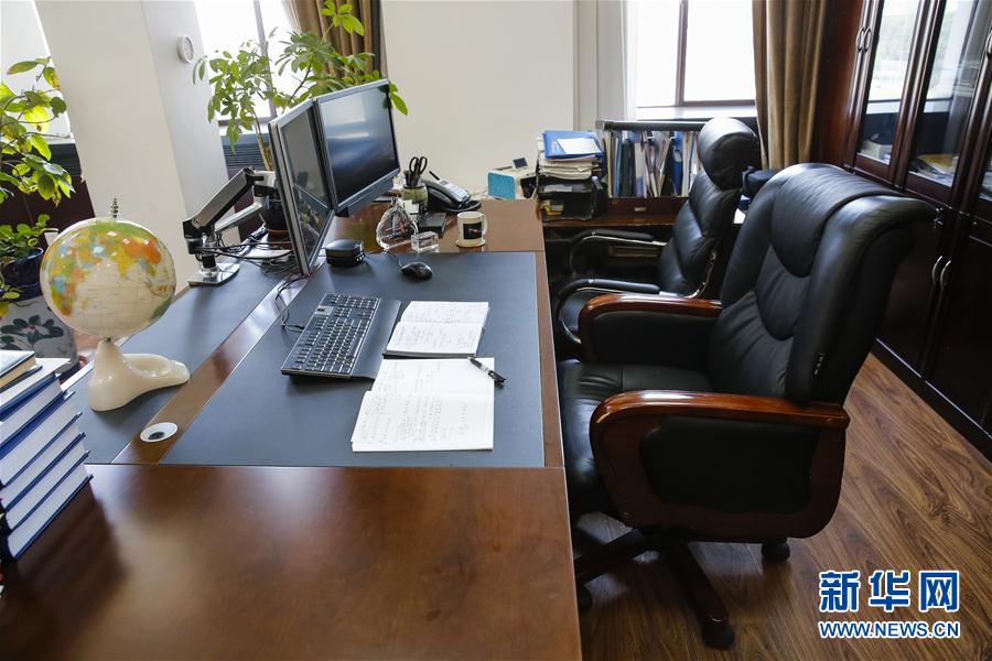 吉林大學地球探測科學與技術學院移動平臺探測技術研發中心黃大年老師生前的辦公桌(2017年6月15日攝)。黃老師在自己的椅子邊多放了一把椅子,這樣學生或者其他老師來和他談工作時,能坐在一起交流。今年1月8日,國家“千人計劃”入選專家、吉林大學地球探測科學與技術學院教授黃大年,為執著追求的教育科研事業燃盡最后一絲心血后闔然長逝。半年過去,這位戰略科學家的身影已經遠去,而他的事跡卻被越來越多人熟知。近日,記者再次走訪黃大年生前的同事、學生,聽他們講述昔日與黃老師在一起的難忘瞬間。新華社記者 沈伯韓 攝