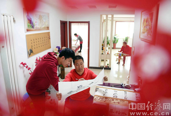 2017年12月23日,河北省保定市蓮池區西高莊村民謝紅影(右一)和兒子謝度宇在家中研習書法。
