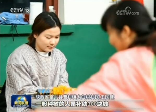 陜西省富平縣曹村鎮太白村村民 王國建:政府補助苗木,發放肥料,發放(削皮)機子。一般種樹的人是補助300塊錢,在貧困戶這塊是每畝地補助400塊錢。