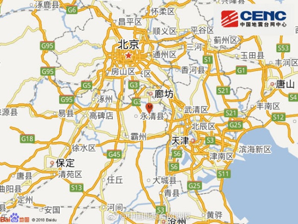 2018年2月12日18時31分,河北省廊坊市永清縣發(fā)生4.3級地震,圖為震中位置。(圖片來源:中國地震臺網)