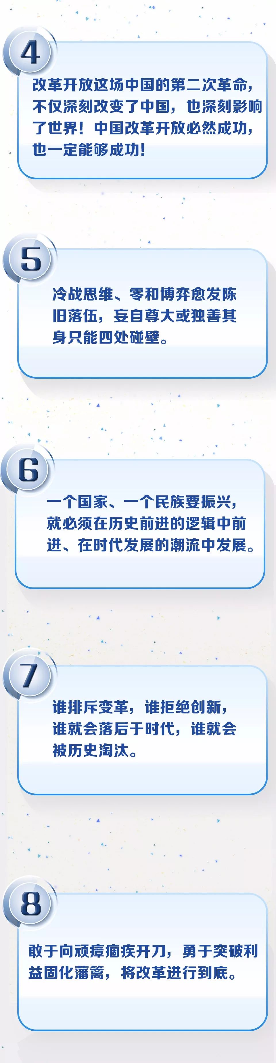 習(xí)主席在演講中,對中國改革開放偉大成就、重要經(jīng)驗和啟示、世界意義和影響,以及在新的歷史當(dāng)口中國將如何推動對外開放再擴大、深化改革再出發(fā)作出最權(quán)威的闡述。