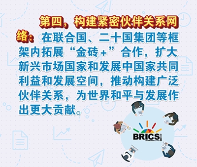 第四,構(gòu)建緊密伙伴關(guān)系網(wǎng)絡(luò)。金磚機(jī)制成立伊始,我們就共同確定了走開放包容之路的正確方向。廈門會晤更確立了“金磚+”合作理念,其要義是在不斷強(qiáng)化五國團(tuán)結(jié)協(xié)作內(nèi)核,提升金磚向心力、凝聚力的同時,持續(xù)擴(kuò)大金磚“朋友圈”,同廣大新興市場國家和發(fā)展中國家實現(xiàn)共同發(fā)展繁榮。我們要在聯(lián)合國、二十國集團(tuán)等框架內(nèi)拓展“金磚+”合作,擴(kuò)大新興市場國家和發(fā)展中國家共同利益和發(fā)展空間,推動構(gòu)建廣泛伙伴關(guān)系,為世界和平與發(fā)展作出更大貢獻(xiàn)。