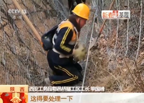 將近90度的陡坡,完全沒有路,腳下踩著防護網,手上也緊緊抓住防護網,單國峰帶著大家,就這樣一步一步挪到隧道口上方。在一處凸起的大石頭上,單國峰發現有隱患。