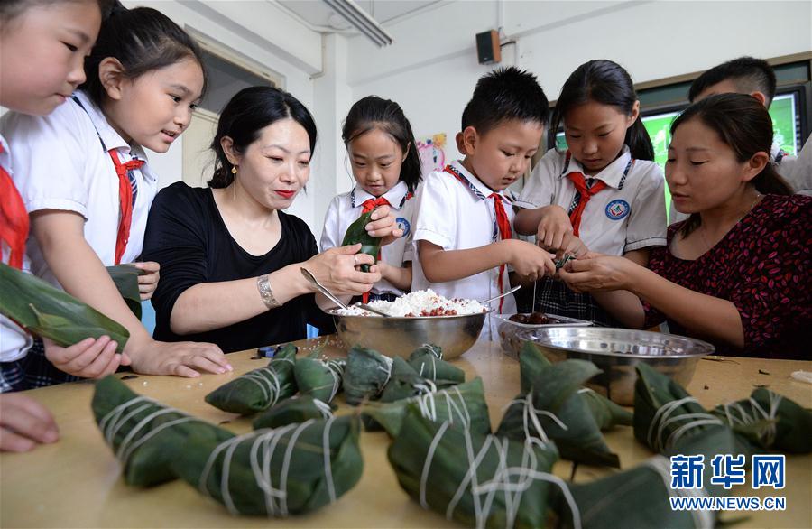 6月3日,河北省邯鄲市浴新南小學學生在老師指導下學包粽子。 端午將至,人們參加多彩民俗活動迎接傳統節日的到來。 新華社發(郝群英攝)