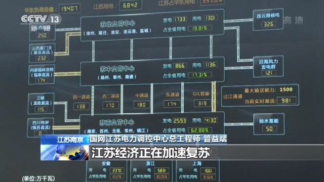 國網江蘇電力調控中心總工程師 管益斌:3月30日、31日,全省日用電量超去年同期工作日4.67個百分點。從電量上分析,復產率達91.4%,江蘇經濟正在加速復蘇。
