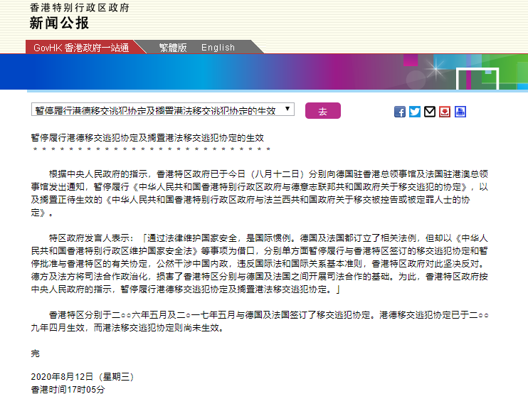 根據中央人民政府的指示,香港特區政府已于今日(8月12日)分別向德國駐香港總領事館及法國駐港澳總領事館發出通知,暫停履行《中華人民共和國香港特別行政區政府與德意志聯邦共和國政府關于移交逃犯的協定》,以及擱置正待生效的《中華人民共和國香港特別行政區政府與法蘭西共和國政府關于移交被控告或被定罪人士的協定》。