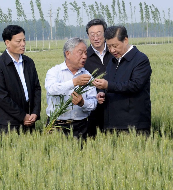 △2014年5月9日下午,習近平總書記來到河南省尉氏縣張市鎮,走進一片高標準糧田,看麥穗灌漿,問農田建設。