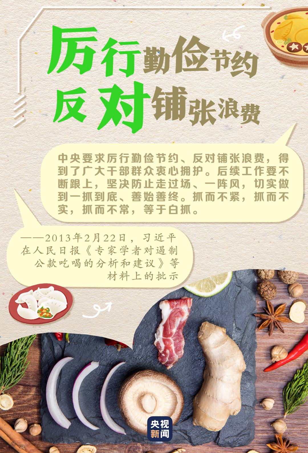 黨的十八大以來,習近平多次對如何厲行節儉作出指示,強調要建立剛性的制度約束、嚴格的制度執行、強有力的監督檢查、嚴厲的懲戒機制。