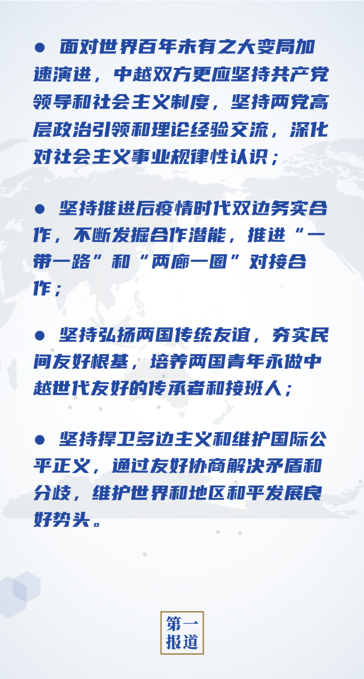習(xí)近平強調(diào),中國和越南山水相連,兩國在意識形態(tài)、發(fā)展道路、社會制度、價值理念等方面高度一致,把雙邊關(guān)系發(fā)展好符合兩國和兩國人民根本利益。今年是中越建交70周年,兩黨兩國關(guān)系邁上新的歷史起點。疫情之下中越雙邊貿(mào)易等合作呈現(xiàn)出強勁增長勢頭,彰顯了中越關(guān)系的韌性和潛力。面對世界百年未有之大變局加速演進,中越雙方更應(yīng)堅持共產(chǎn)黨領(lǐng)導(dǎo)和社會主義制度,堅持兩黨高層政治引領(lǐng)和理論經(jīng)驗交流,深化對社會主義事業(yè)規(guī)律性認識;堅持推進后疫情時代雙邊務(wù)實合作,不斷發(fā)掘合作潛能,推進“一帶一路”和“兩廊一圈”對接合作;堅持弘揚兩國傳統(tǒng)友誼,夯實民間友好根基,培養(yǎng)兩國青年永做中越世代友好的傳承者和接班人;堅持捍衛(wèi)多邊主義和維護國際公平正義,通過友好協(xié)商解決矛盾和分歧,維護世界和地區(qū)和平發(fā)展良好勢頭。中國共產(chǎn)黨支持越南共產(chǎn)黨開好十三大,愿繼續(xù)為越南社會主義建設(shè)事業(yè)提供力所能及的支持和幫助。
