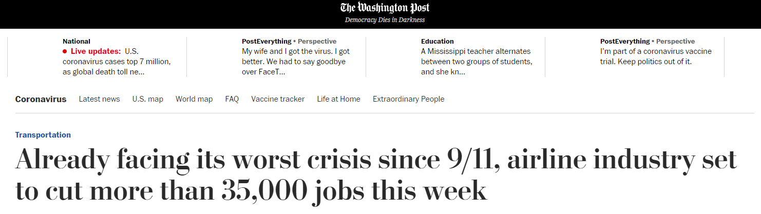 △《華盛頓郵報》:美國航空業正面臨“911”以來最嚴重的危機,本周將裁員35000多人。