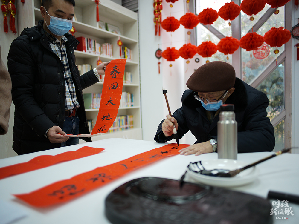 △84歲的社區(qū)居民戴世倫老先生,曾在貴州廣播電視大學任教。這是他寫的春聯。(總臺央視記者彭漢明、姚瑤拍攝)