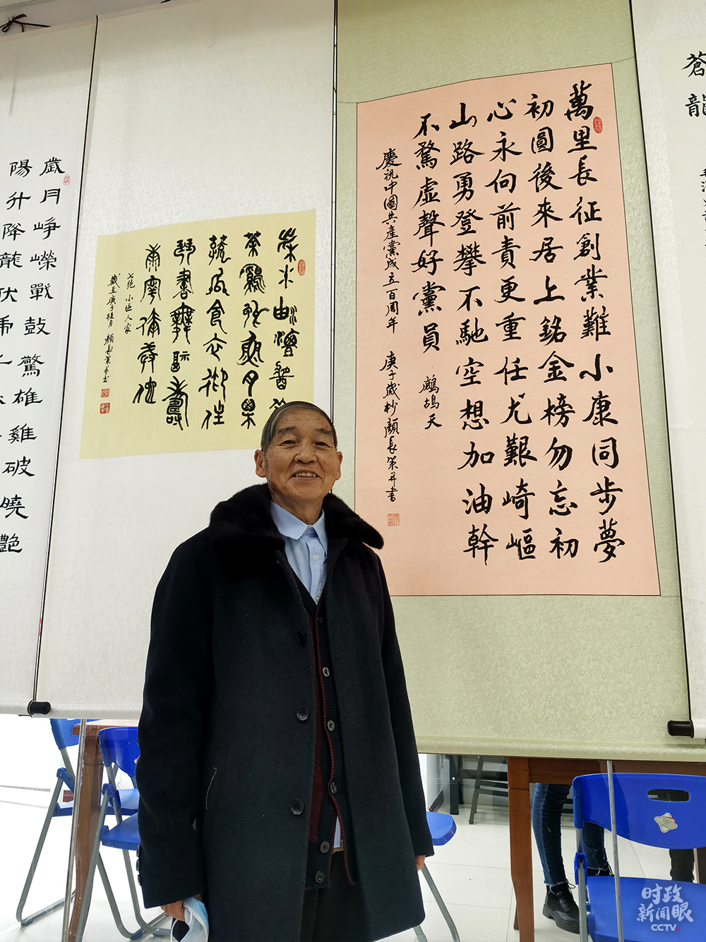 △這是87歲的社區(qū)居民顏長策老先生為慶祝中國共產黨成立100周年創(chuàng)作并書寫的詩作。(總臺央視記者姚瑤拍攝)