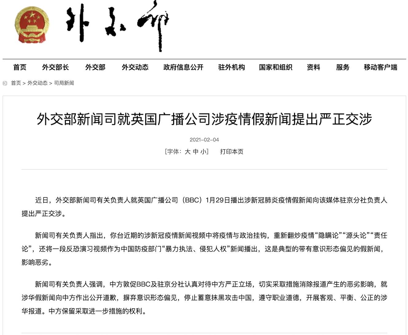 2月4日,外交部新聞司發(fā)布聲明,就BBC涉疫情假新聞提出嚴(yán)正交涉,敦促BBC就涉華假新聞向中方作出公開道歉。