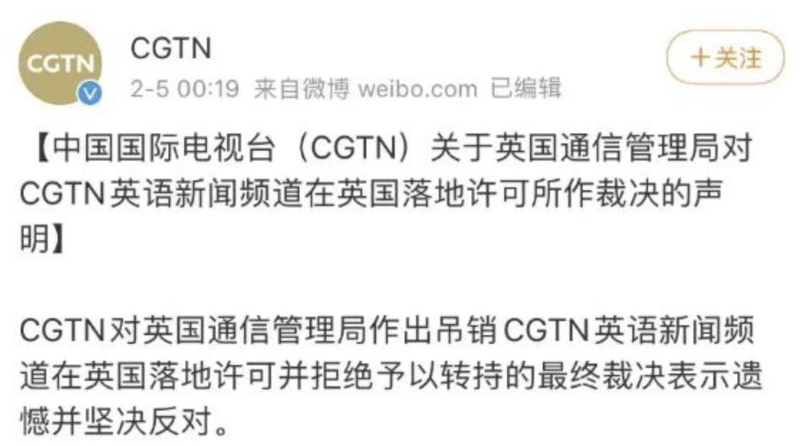 圖丨英國通信管理局吊銷CGTN在英落地許可的聲明和CGTN的回應(yīng)聲明