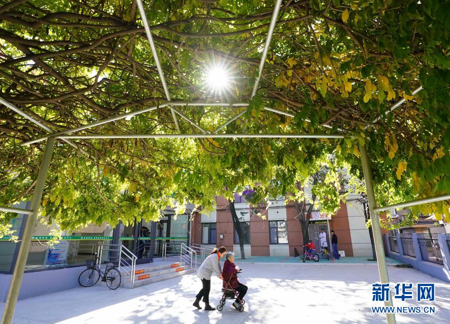 2020年10月24日,在河北省唐山市路北區煤研分院社區幸福家園養老服務中心,工作人員陪護一位老人在院內活動。新華社記者 楊世堯 攝