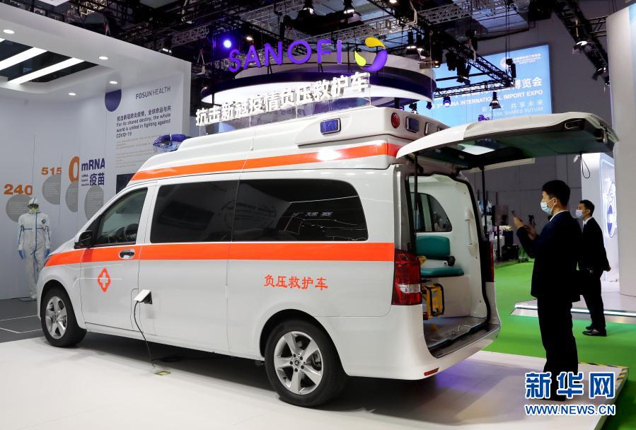 2020年11月5日在第三屆中國國際進口博覽會公共衛生防疫專區拍攝的復星醫藥展出的負壓救護車。新華社記者 劉穎 攝