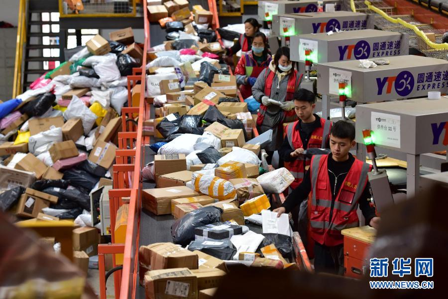 2020年11月3日,在位于貴州省龍里縣的貴州快遞物流園圓通速遞貴州分撥中心,工作人員分揀貨件。新華社發(龍毅 攝)