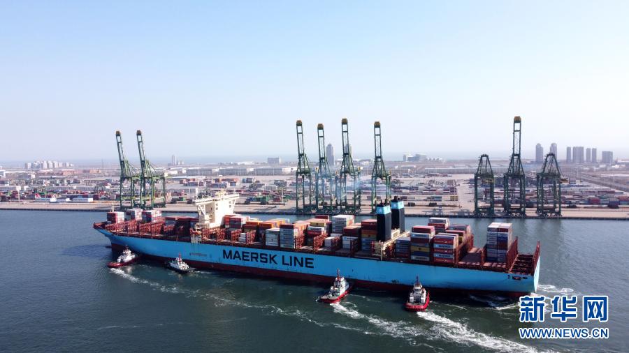 2月22日,一艘載有集裝箱的貨輪駛入天津港碼頭(無人機照片)。新華社記者 趙子碩 攝