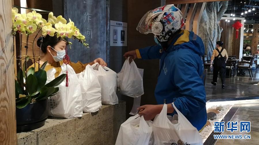 2月17日,外賣配送員在成都一家火鍋店交接消費者在線上下單的外賣火鍋(手機照片)。新華社記者 胡旭 攝