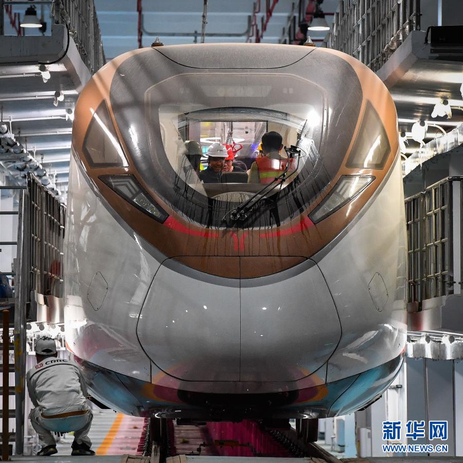 參加熱滑試驗的技術人員對廣州地鐵18號線時速160公里電客車進行發車前最后一次設備狀況查驗(3月3日攝)。新華社記者 劉大偉 攝