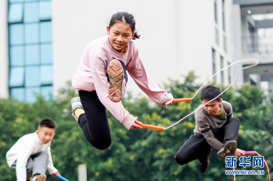 2020年12月9日,重慶市九龍坡區西彭鎮第一小學校跳繩隊隊員在進行花樣跳繩訓練。該校從1999年開始引進跳繩,開展特色體育活動。新華社記者 劉潺 攝