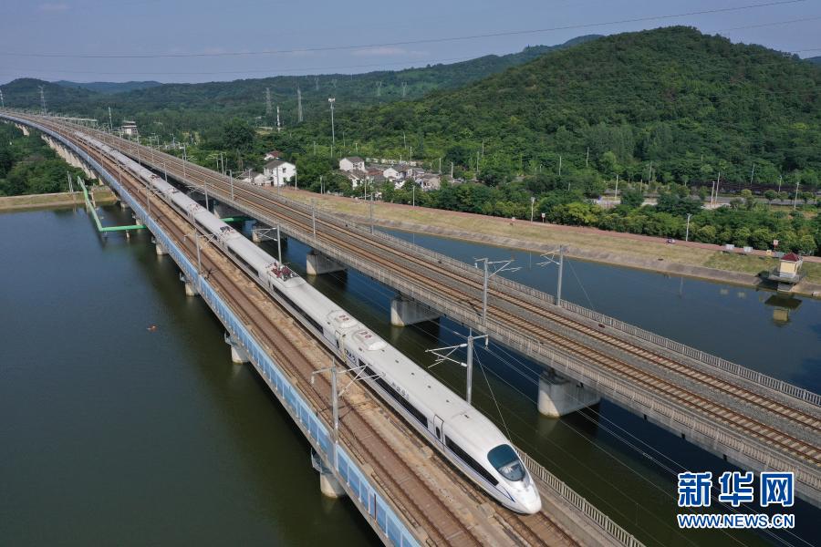 一列和諧號動車組列車駛經京滬高速鐵路南京段(無人機照片,2020年6月30日攝)。新華社發(方東旭 攝)