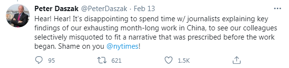 美國專家彼得·達(dá)薩克博士在社交媒體上駁斥《紐約時報》的報道。圖為截屏