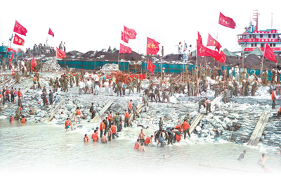 1998年8月7日下午,江西九江城防大堤4至5號閘口被兇猛的江洪撕開60米缺口,九江城和京九鐵路危在旦夕。黨中央、國務院和中央軍委周密部署,幾路官兵迅即奔赴九江,支援堵口搶險。在九江生死大決戰的關鍵時刻,人民子弟兵連續激戰5個日夜,重新在決口處筑起一座“鋼鐵大壩”,險情終于得到控制。