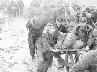 1998年7月,為確保荊江大堤的安全,數千名解放軍官兵以驚人的毅力堅守在大堤上,排除決堤險情。圖為戰士們運送袋裝沙石加固大堤。