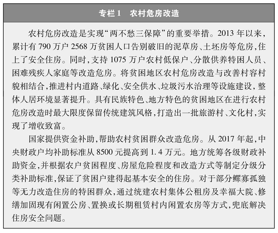 “兩不愁三保障”全面實(shí)現(xiàn)。脫貧攻堅(jiān)普查⑧顯示,貧困戶全面實(shí)現(xiàn)不愁吃、不愁穿,平時(shí)吃得飽且能適當(dāng)吃好,一年四季都有應(yīng)季的換洗衣物和御寒被褥。貧困人口受教育的機(jī)會(huì)顯著增多、水平持續(xù)提高,農(nóng)村貧困家庭子女義務(wù)教育階段輟學(xué)問題實(shí)現(xiàn)動(dòng)態(tài)清零,2020年貧困縣九年義務(wù)教育鞏固率達(dá)到94.8%。持續(xù)完善縣鄉(xiāng)村三級(jí)醫(yī)療衛(wèi)生服務(wù)體系,把貧困人口全部納入基本醫(yī)療保險(xiǎn)、大病保險(xiǎn)、醫(yī)療救助三重制度保障范圍,實(shí)施大病集中救治、慢病簽約管理、重病兜底保障等措施,99.9%以上的貧困人口參加基本醫(yī)療保險(xiǎn),全面實(shí)現(xiàn)貧困人口看病有地方、有醫(yī)生、有醫(yī)療保險(xiǎn)制度保障,看病難、看病貴問題有效解決。實(shí)施農(nóng)村危房改造,貧困人口全面實(shí)現(xiàn)住房安全有保障(專欄1)。實(shí)施農(nóng)村飲水安全和鞏固提升工程,累計(jì)解決2889萬貧困人口的飲水安全問題,飲用水量和水質(zhì)全部達(dá)標(biāo),3.82億農(nóng)村人口受益;貧困地區(qū)自來水普及率從2015年的70%提高到2020年的83%。