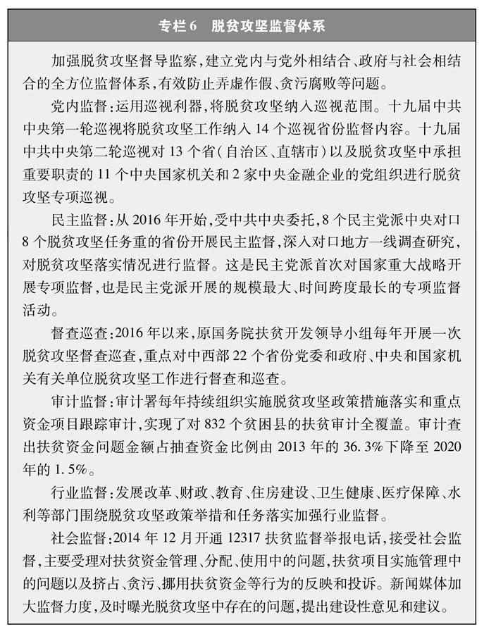 脫貧攻堅(jiān)涉及面廣、要素繁多、極其復(fù)雜,需要強(qiáng)有力的組織領(lǐng)導(dǎo)和貫徹執(zhí)行。充分發(fā)揮黨的政治優(yōu)勢(shì)、組織優(yōu)勢(shì),建立中央統(tǒng)籌、省負(fù)總責(zé)、市縣抓落實(shí)的脫貧攻堅(jiān)管理體制和片為重點(diǎn)、工作到村、扶貧到戶的工作機(jī)制,構(gòu)建起橫向到邊、縱向到底的工作體系。各級(jí)黨委充分發(fā)揮總攬全局、協(xié)調(diào)各方的作用,執(zhí)行脫貧攻堅(jiān)一把手負(fù)責(zé)制,中西部22個(gè)省份黨政主要負(fù)責(zé)同志向中央簽署責(zé)任書、立下軍令狀,省市縣鄉(xiāng)村五級(jí)書記一起抓。脫貧攻堅(jiān)期內(nèi),貧困縣黨委政府正職保持穩(wěn)定。有脫貧任務(wù)的地區(qū),倒排工期、落實(shí)責(zé)任,抓緊施工、強(qiáng)力推進(jìn)。脫貧攻堅(jiān)任務(wù)重的地區(qū),把脫貧攻堅(jiān)作為頭等大事和第一民生工程,以脫貧攻堅(jiān)統(tǒng)攬經(jīng)濟(jì)社會(huì)發(fā)展全局。實(shí)行最嚴(yán)格的考核評(píng)估和監(jiān)督檢查,組織脫貧攻堅(jiān)專項(xiàng)巡視,開展扶貧領(lǐng)域腐敗和作風(fēng)問題專項(xiàng)治理(專欄5),加強(qiáng)脫貧攻堅(jiān)督導(dǎo)和監(jiān)察(專欄6),確保扶貧工作務(wù)實(shí)、脫貧過程扎實(shí)、脫貧結(jié)果真實(shí),使脫貧攻堅(jiān)成果經(jīng)得起實(shí)踐和歷史檢驗(yàn)。建立健全干部擔(dān)當(dāng)作為的激勵(lì)和保護(hù)機(jī)制,加大關(guān)心關(guān)愛干部力度,樹立正確用人導(dǎo)向,引導(dǎo)廣大干部在決勝脫貧攻堅(jiān)中奮發(fā)有為、履職盡責(zé)。加強(qiáng)基層扶貧隊(duì)伍建設(shè),普遍建立干部駐村幫扶工作隊(duì)制度,按照因村派人、精準(zhǔn)選派的原則,選派政治素質(zhì)好、工作能力強(qiáng)、作風(fēng)實(shí)的干部駐村扶貧。廣大駐村干部牢記使命、不負(fù)重托,心系貧困群眾,扎根基層扶貧一線,傾心傾力幫助貧困群眾找出路、謀發(fā)展、早脫貧。從2013年開始向貧困村選派第一書記和駐村工作隊(duì),到2015年,實(shí)現(xiàn)每個(gè)貧困村都有駐村工作隊(duì)、每個(gè)貧困戶都有幫扶責(zé)任人。截至2020年底,全國累計(jì)選派25.5萬個(gè)駐村工作隊(duì)、300多萬名第一書記和駐村干部,同近200萬名鄉(xiāng)鎮(zhèn)干部和數(shù)百萬村干部一道奮戰(zhàn)在扶貧一線。