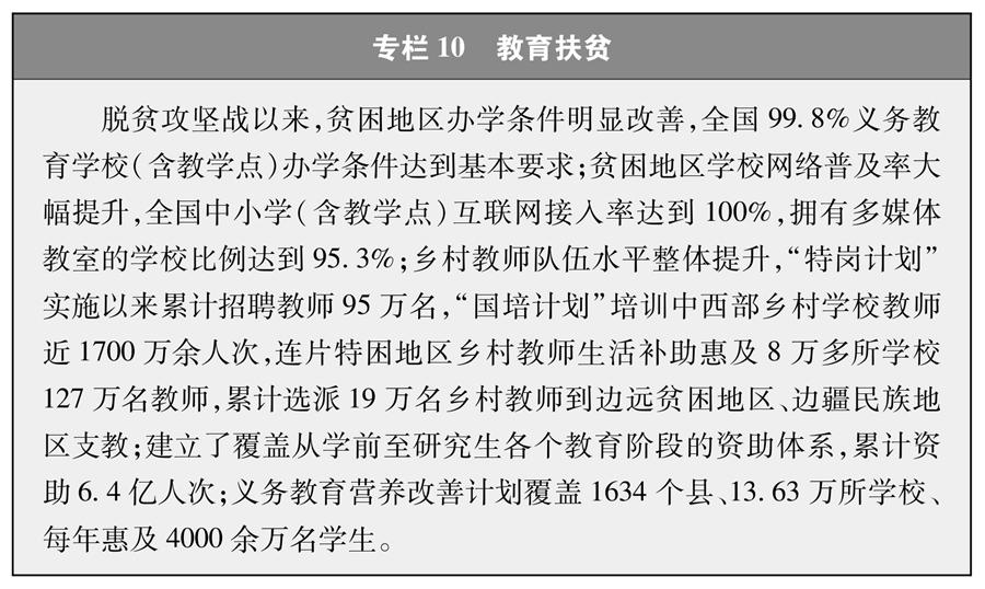 發(fā)展教育脫貧一批。堅(jiān)持再窮不能窮教育、再窮不能窮孩子,加強(qiáng)教育扶貧,不讓孩子輸在起跑線上,努力讓每個(gè)孩子都有人生出彩的機(jī)會(huì),阻斷貧困代際傳遞(專欄10)。持續(xù)提升貧困地區(qū)學(xué)校、學(xué)位、師資、資助等保障能力,20多萬名義務(wù)教育階段的貧困家庭輟學(xué)學(xué)生全部返校就讀,全面實(shí)現(xiàn)適齡少年兒童義務(wù)教育有保障。實(shí)施定向招生、學(xué)生就業(yè)、職教脫貧等傾斜政策,幫助800多萬貧困家庭初高中畢業(yè)生接受職業(yè)教育培訓(xùn)、514萬名貧困家庭學(xué)生接受高等教育,重點(diǎn)高校定向招收農(nóng)村和貧困地區(qū)學(xué)生70多萬人,拓寬貧困學(xué)生縱向流動(dòng)渠道。開展民族地區(qū)農(nóng)村教師和青壯年農(nóng)牧民國家通用語言文字培訓(xùn),累計(jì)培訓(xùn)350萬余人次,提升民族地區(qū)貧困人口就業(yè)能力。“學(xué)前學(xué)會(huì)普通話”行動(dòng)先后在四川省涼山彝族自治州和樂山市馬邊彝族自治縣、峨邊彝族自治縣、金口河區(qū)開展試點(diǎn),覆蓋43萬學(xué)齡前兒童,幫助他們學(xué)會(huì)普通話。