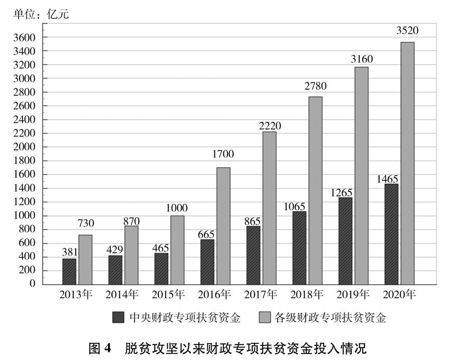 貧困地區(qū)發(fā)展條件差,貧困人口自我發(fā)展能力弱,消除貧困僅僅依靠個(gè)體、區(qū)域、民間等力量遠(yuǎn)遠(yuǎn)不夠,必須作為執(zhí)政黨和國家的責(zé)任,上升為國家意志、國家戰(zhàn)略、國家行動(dòng)。中國共產(chǎn)黨始終把消除貧困作為定國安邦的重要任務(wù),制定實(shí)施一個(gè)時(shí)期黨的路線方針政策、提出國家中長期發(fā)展規(guī)劃建議,都把減貧作為重要內(nèi)容,從國家層面部署,運(yùn)用國家力量推進(jìn)。幾代中國共產(chǎn)黨人,錨定一個(gè)目標(biāo),一茬接著一茬干。中共十八大以來,中國共產(chǎn)黨把脫貧攻堅(jiān)擺在治國理政的突出位置,加強(qiáng)黨的集中統(tǒng)一領(lǐng)導(dǎo),統(tǒng)籌謀劃、強(qiáng)力推進(jìn)。從黨的領(lǐng)袖到廣大黨員干部,情系貧困群眾、心懷減貧大業(yè),全黨目標(biāo)一致、上下同心。加強(qiáng)頂層設(shè)計(jì)和戰(zhàn)略規(guī)劃,制定印發(fā)《關(guān)于打贏脫貧攻堅(jiān)戰(zhàn)的決定》《關(guān)于打贏脫貧攻堅(jiān)戰(zhàn)三年行動(dòng)的指導(dǎo)意見》等政策文件,明確目標(biāo)、路徑和具體措施并一以貫之抓下去。各級(jí)財(cái)政不斷加大投入力度(圖4),構(gòu)建多元資金投入體系(專欄12),為減貧事業(yè)發(fā)展提供資金保障。發(fā)揮社會(huì)主義制度集中力量辦大事的優(yōu)勢(shì),廣泛動(dòng)員各方力量積極參與。建立脫貧攻堅(jiān)責(zé)任體系、政策體系、組織體系、投入體系、動(dòng)員體系、監(jiān)督體系、考核評(píng)估體系等制度體系,為脫貧攻堅(jiān)順利推進(jìn)提供了有力支撐。