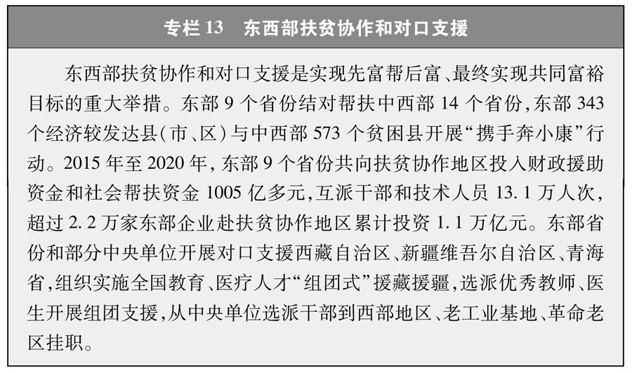 扶貧減貧是艱巨復(fù)雜的系統(tǒng)工程,需要調(diào)動(dòng)各方積極參與。為打贏脫貧攻堅(jiān)戰(zhàn),中國共產(chǎn)黨依托嚴(yán)密組織體系和高效運(yùn)行機(jī)制,廣泛有效動(dòng)員和凝聚各方力量,構(gòu)建政府、社會(huì)、市場(chǎng)協(xié)同推進(jìn),專項(xiàng)扶貧、行業(yè)扶貧、社會(huì)扶貧互為補(bǔ)充的大扶貧格局,形成跨地區(qū)、跨部門、跨單位、全社會(huì)共同參與的多元主體的社會(huì)扶貧體系。加強(qiáng)東西部扶貧協(xié)作和對(duì)口支援(專欄13),推動(dòng)省市縣各層面幫扶,促進(jìn)人才、資金、技術(shù)向貧困地區(qū)流動(dòng),實(shí)現(xiàn)優(yōu)勢(shì)互補(bǔ),縮小區(qū)域差距。積極開展定點(diǎn)扶貧,組織各級(jí)黨政機(jī)關(guān)、人民團(tuán)體、國有企事業(yè)單位和軍隊(duì)幫扶貧困縣或貧困村(專欄14)。各民主黨派、工商聯(lián)和無黨派人士充分發(fā)揮各自優(yōu)勢(shì),為打贏脫貧攻堅(jiān)戰(zhàn)獻(xiàn)智獻(xiàn)力。積極推動(dòng)各行各業(yè)發(fā)揮專業(yè)優(yōu)勢(shì),開展產(chǎn)業(yè)扶貧、科技扶貧、教育扶貧、文化扶貧、健康扶貧、消費(fèi)扶貧。廣泛動(dòng)員民營企業(yè)參與扶貧開發(fā),引導(dǎo)市場(chǎng)開發(fā)能力強(qiáng)的主體進(jìn)入資源開發(fā)潛力大的地區(qū),實(shí)現(xiàn)互惠互利、共同發(fā)展(專欄15)。廣泛動(dòng)員社會(huì)組織、公民個(gè)人積極參與脫貧攻堅(jiān),開展扶貧公益活動(dòng)。設(shè)立國家扶貧日,建立脫貧攻堅(jiān)國家榮譽(yù)制度,表彰脫貧攻堅(jiān)先進(jìn)典型,營造了人人愿為、人人可為、人人能為的社會(huì)幫扶氛圍。